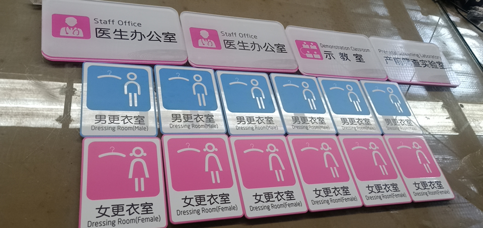 室內(nèi)的標(biāo)識(shí)牌主要包括索引牌、科室牌、溫馨提示牌、樓層吊牌、樓層索引牌、電梯指示牌、人員去向牌、桌面臺(tái)牌等等,最常用的材料就是鋁型材了,再配合亞克力、PVC、雙色板等材料一起使用有多種多樣的效果。