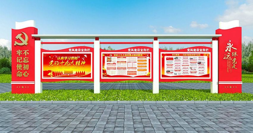 黨建文化宣傳欄是一種近年來(lái)流行在城鎮(zhèn),鄉(xiāng)村,市政,社區(qū)等公共資源大院的標(biāo)志性愛(ài)國(guó)愛(ài)黨政治產(chǎn)物,我們看到黨建兩個(gè)字就可以聯(lián)想到這是為宣傳,為公示,為思想建設(shè)的標(biāo)識(shí)牌,豎立在市政大院或廣場(chǎng)一偶,便有了黨與人民心結(jié)相同的聯(lián)姻。這里黨建文化標(biāo)識(shí)或是社會(huì)主義價(jià)值觀標(biāo)識(shí)引人注目,宣傳作用效果顯著。讓往來(lái)人群感受有所不同的實(shí)時(shí)訊息及黨政教育和思想的傳達(dá)。