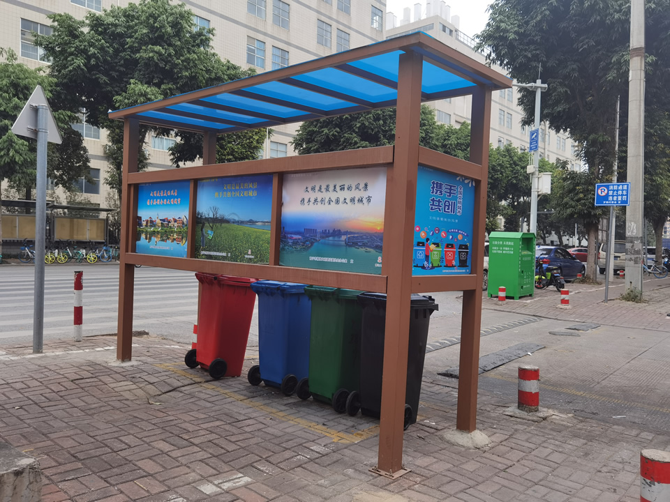 以上步驟完成了垃圾分類亭框架的安裝,基本大功告成,工人在最后階段要在檢查一遍產(chǎn)品是否安裝規(guī)范。最后將各分類垃圾桶依次放進垃圾分類亭內(nèi),整個安裝步驟才算完成。